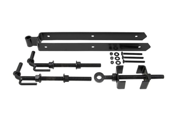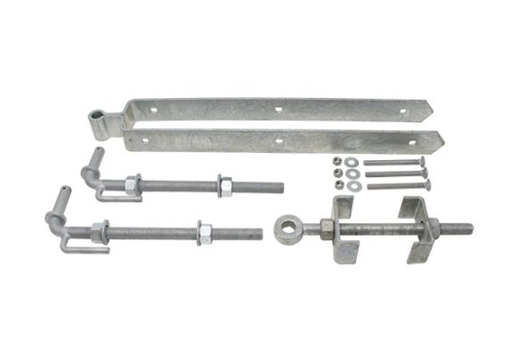 Our Double Strap Hinges with Central Eye Hardware Sets come complete with all the hardware required for a central mount/between post mount application. This set provides for heavy duty construction and maximum strength with easy adjustment. Double straps and pins are our best hardware combination for larger field gates, rail gates and entrance gates.